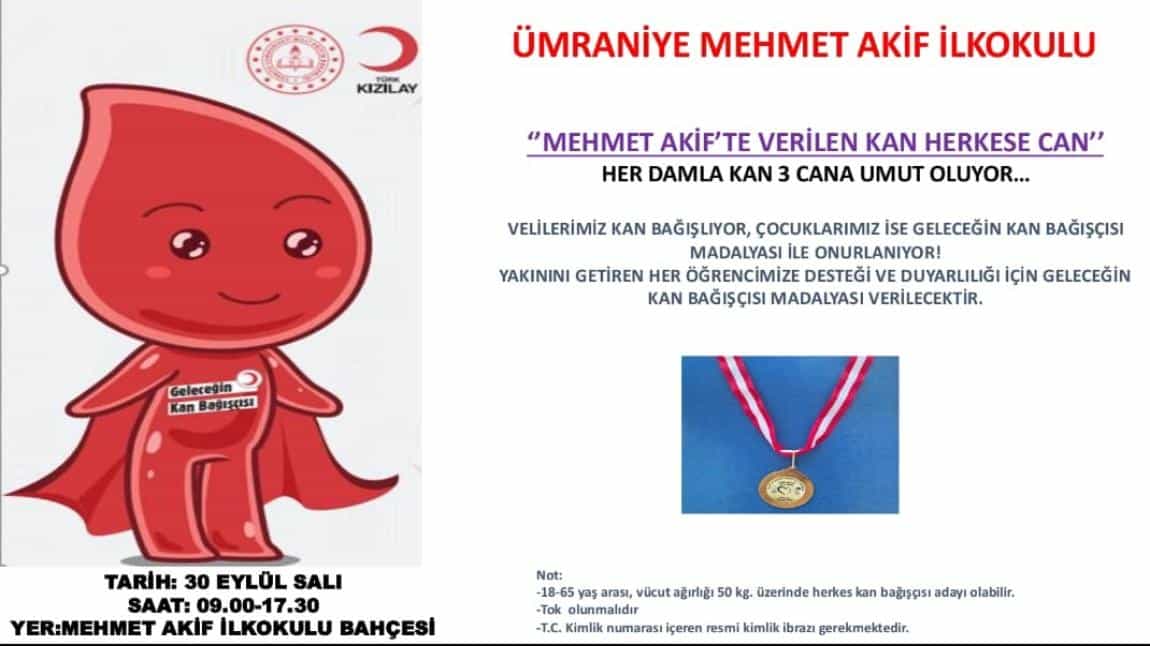 30 Eylül Salı günü 09.00-17.30 saatlerinde okulumuz A bahçesinde bulunacak Kızılay aracılığıyla kan ve kök hücre bağışında bulunarak umut olun, hayat kurtarın. Velilerimiz kan bağışlıyor, çocuklarımız ise geleceğin kan bağışçısı madalyası ile onurlanıyor! Yakınını getiren her öğrencimize desteği ve duyarlılığı için geleceğin kan bağışçısı madalyası verilecektir. Kan bağışı kampanyamıza hepinizi bekliyoruz!
